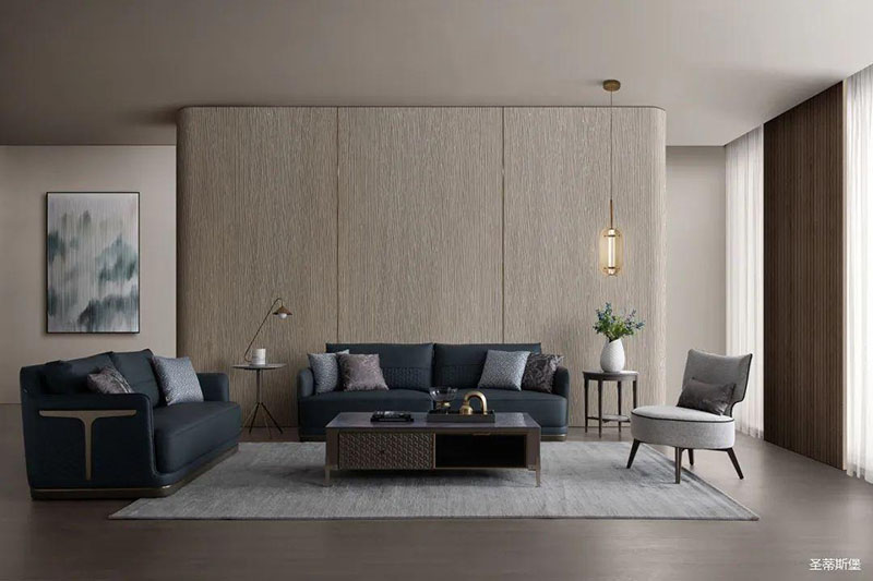疏朗大气的客厅空间,整体采用低明度的木纹色,在保留实木质感同时,也为空间增添了一缕木香。沙发线条利落干净,深邃而浪漫的配色仿佛将居者带进了海洋世界。艺术编制皮料搭配金属底座,时尚大气质感扑面而来,将理性和感性完美结合,提高了居家的时尚格调。